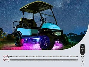 About this item Universal neon underglow LED Lights with Canopy Lights compatible with any Electric or Gas powered golf cart. Atmosphere decoration light good for dressing up your carts in Halloween Parade, Christmas Day, New Year Celebration, etc. 24 Modes: 7 Solid Color, 7 Color Fade, 6 Colorful Fade/Flow, 3 Colorful Cyclic (Flash/Chase/Strobe), and 1 Music Sync. Solid Colors: Red, Blue, Green, Purple, Light Blue, Yellow and White. 4 buttons on the wireless remotes control: ON / OFF / Music / Color Mode. You can switch modes to color cycle, gradient mode, flash mode or music sync. Package includes: (2) 45.8 Inches, (1) 38.5 Inches, (2) 30.5 Inches, (1) 24.4 inches LED waterproof strip lights, Remote Control, Control Box, Harness, and Installation Accessories (Small Clips, Cable Tie, Screws, Tape), User Manual An Extra voltage converter/reducer is NOT required when connect the control box to 12V-80V batteries. To tighten the connection, you may need a 14mm wrench(not contained in package). Easy to install with flexible LED strips that can bend to any shape.